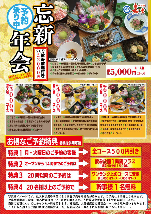 【2026年1月末日まで】お得な予約特典多数!!嘉文の忘新年会!!