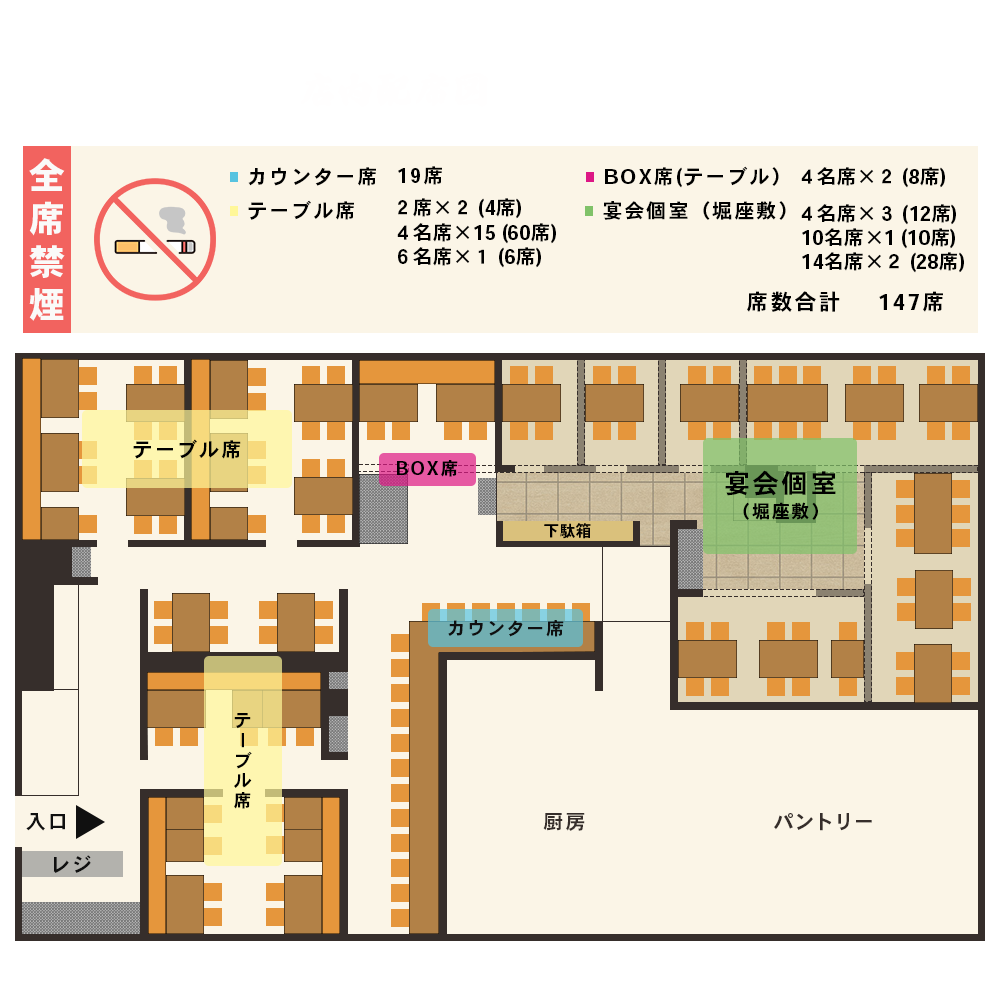 | 宴会個室(堀座敷)(可動式間仕切り) | 4名席×3室(12席) 10名席×1室(10席) 14名席×2室(28席) |